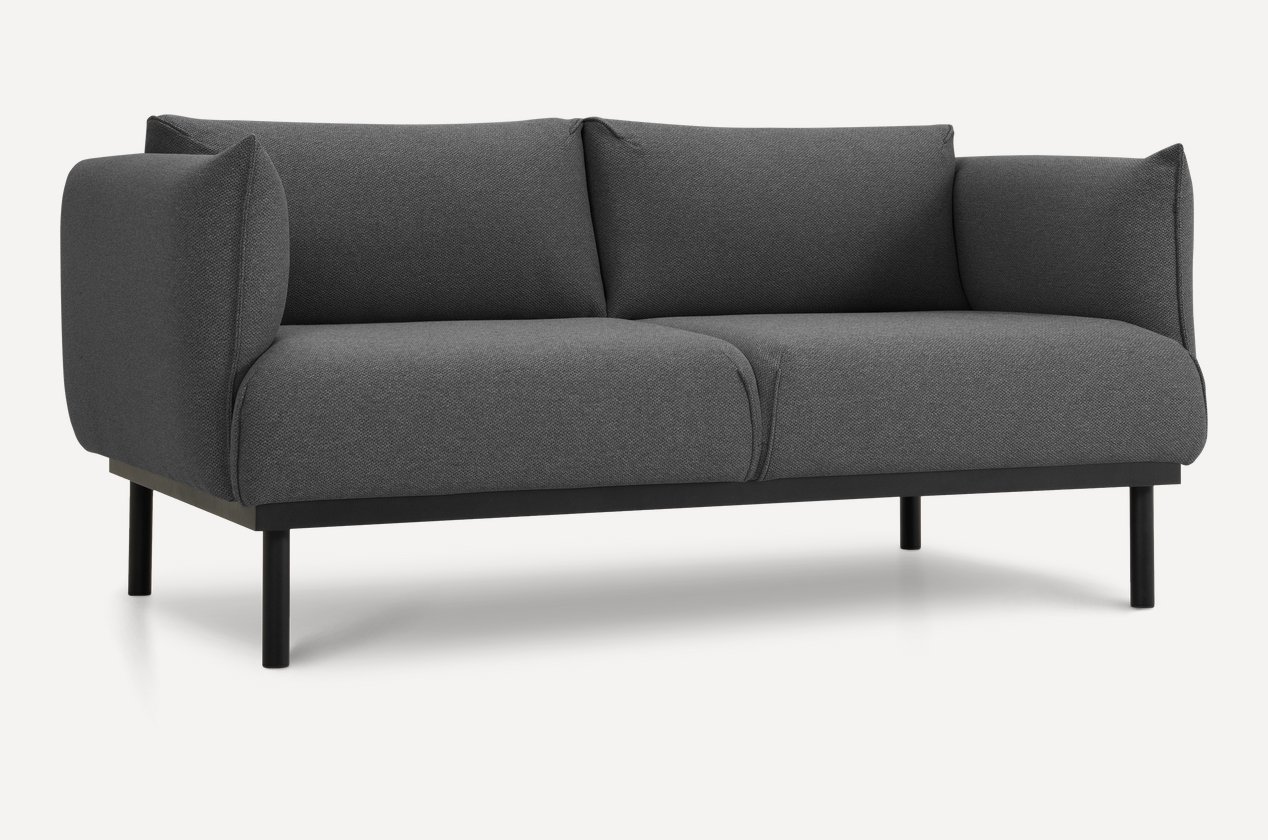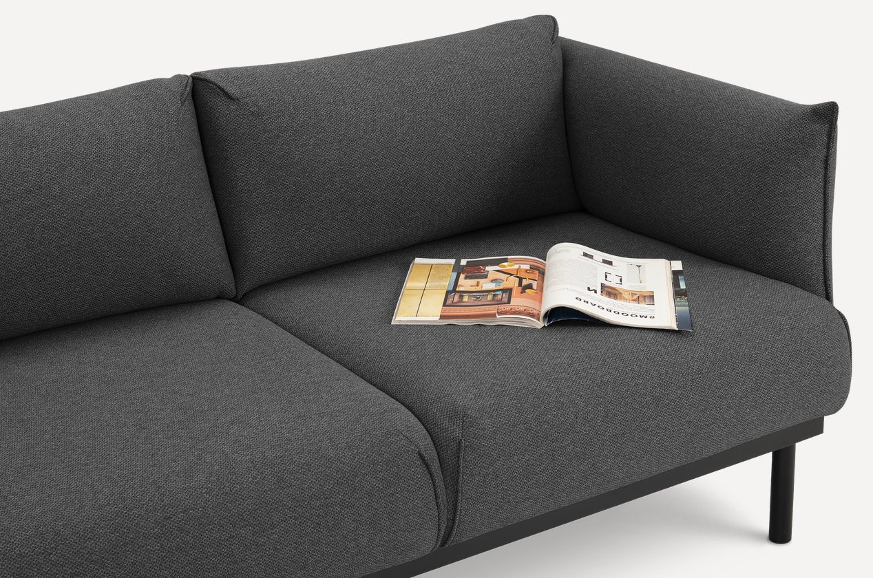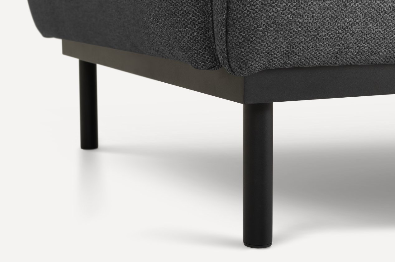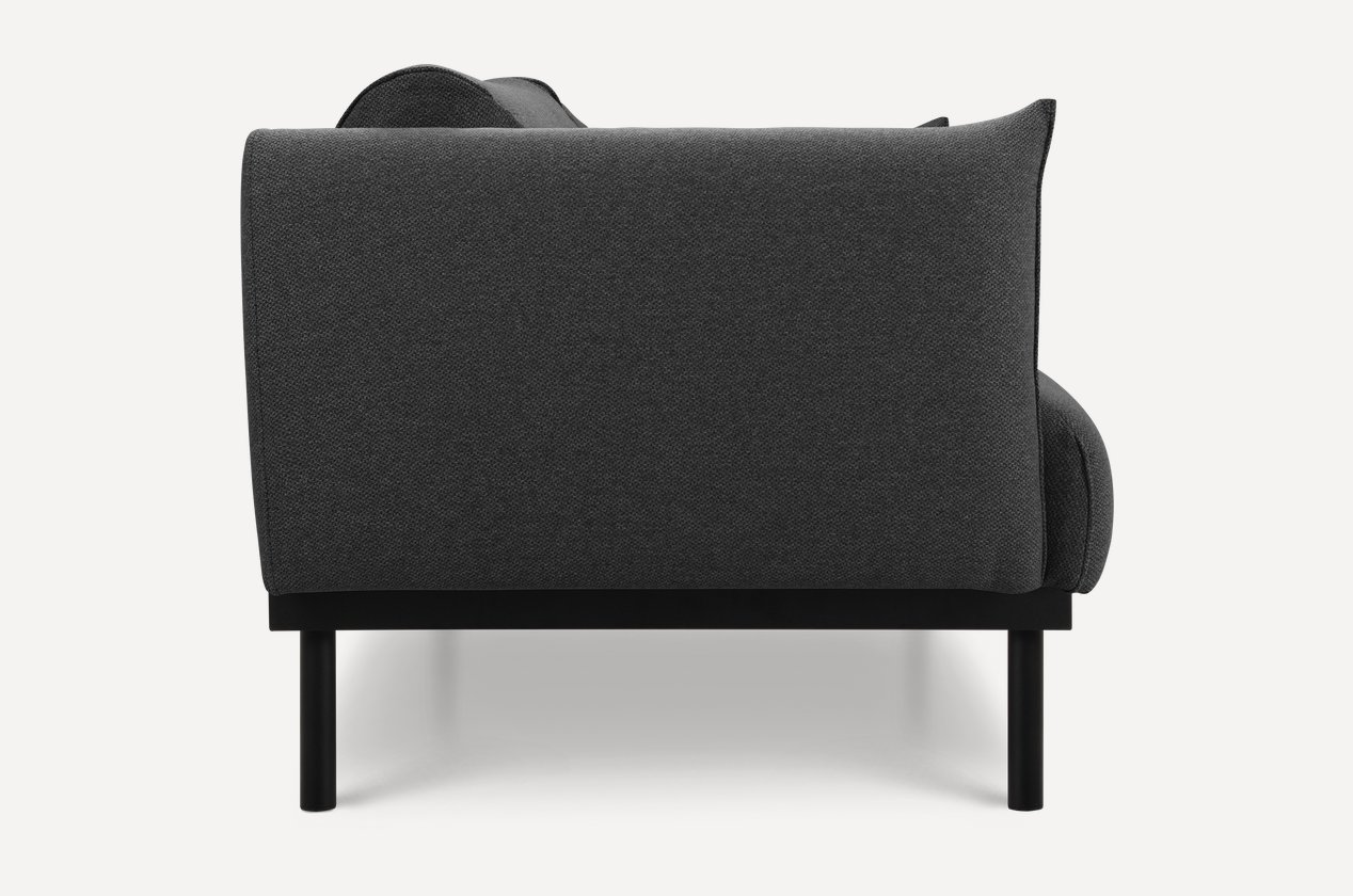 Дизайн дивана без механизма трансформации и без ящика для белья подчёркивает его философию — чистый, незагруженный функционал и минималистичная эстетика. Металлические опоры чёрного цвета приподнимают корпус на 20,5 см, облегчая уборку и визуально «разгружая» пространство.