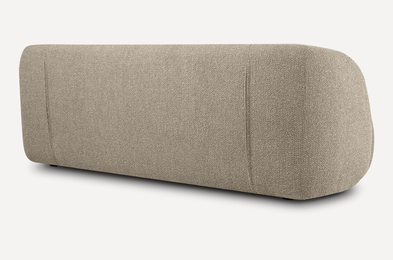 Надёжный каркас из массива, фанеры, ДСП, ДВП и пружинной змейки гарантирует прочность и устойчивость при нагрузке до 100 кг на посадочное место. Пластиковые низкие опоры приподнимают корпус всего на 3 см от пола, визуально облегчая конструкцию, а подлокотники высотой 70 см, обитые той же тканью, добавляют завершённости и удобства.