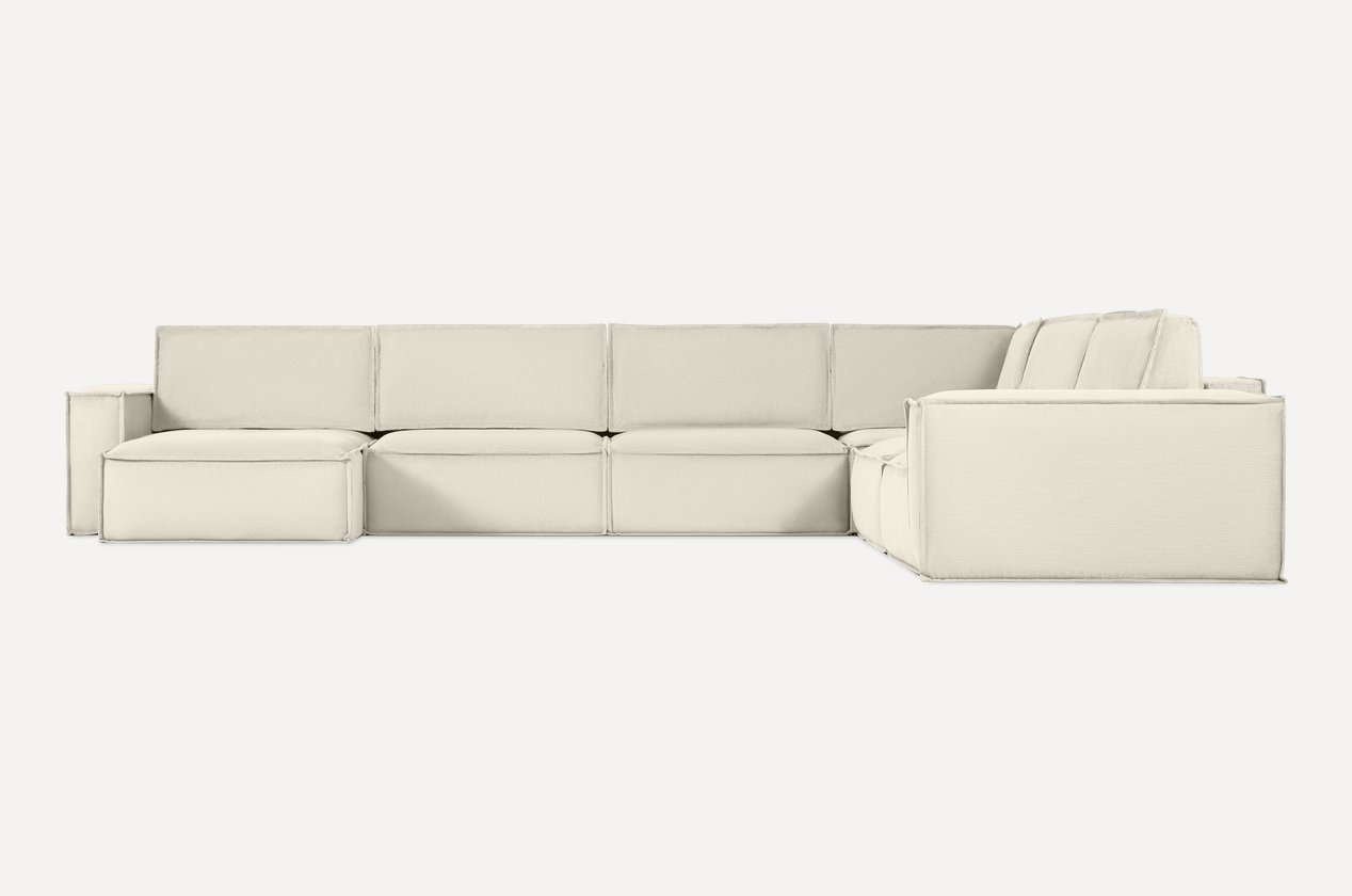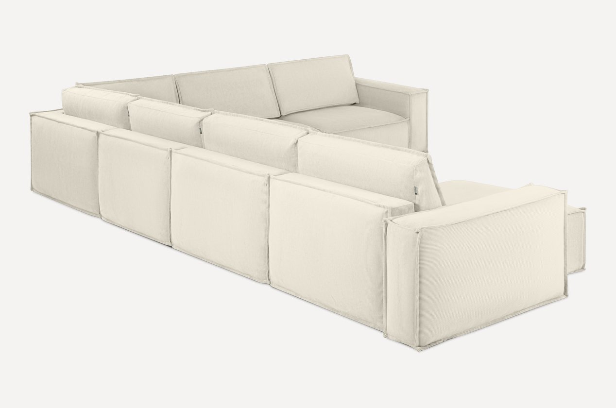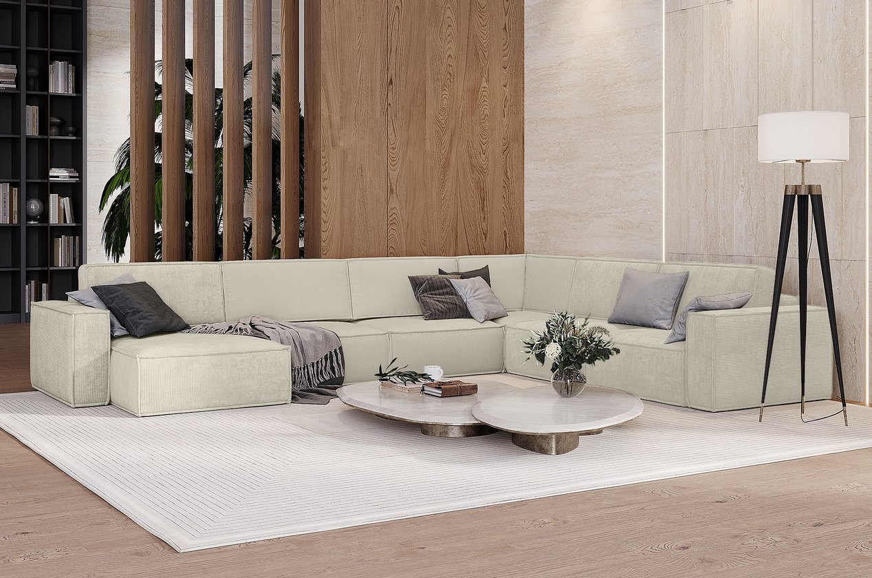 Это П-образная система — идеальная для зонирования пространства, создания уютной зоны для чтения, семейных вечеров или утреннего кофе. Все элементы — в едином молочном цвете, с одинаковой текстурой вельвета — создают гармоничный, цельный, безупречно продуманный ансамбль.