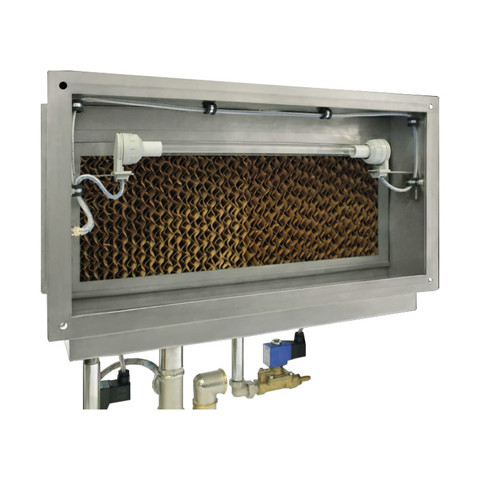 Увлажнитель воздуха Эконау ЕК-12 совмещает функции приточной установки и увлажнителя. По мере поступления в воздуховод воздух насыщается влагой при помощи сотового увлажнителя. Работа агрегата сопровождается небольшим шумом. Все узлы аппарата заключены в корпус из нержавеющей стали, что защищает их от большинства воздействий снаружи.